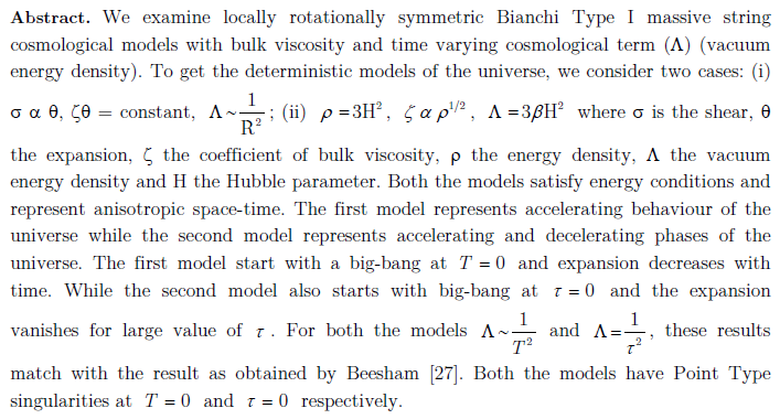 [11] Y. Ilhami and I. Tarhan, "Some string cosmological models in Bianchi type I space time", Astrophys. and Space- Sci., vol. 240, pp. 45-54, 1996.